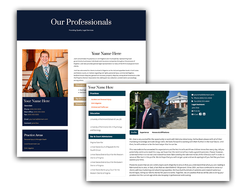 At Stimulus Advertising, we believe your website should be as unique as your practice. Our custom-designed websites are tailored to reflect your firm’s brand, communicate your expertise, and connect with your ideal clients. Say goodbye to cookie-cutter templates and hello to a website that works as hard as you do. We are well-versed in providing custom sites for law firms that effectively communicate their areas of practice and suit their needs.