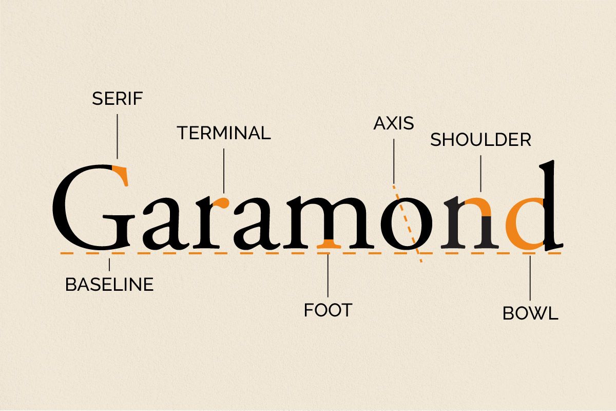 Garamond is a serif font, meaning it has small strokes at the beginnings and ends of the main forms of the letter. Garamond’s serifs are slightly curved at the base and slope downwards on the ascenders. The x-height of Garamond is relatively short, making the capital characters appear large in comparison. Garamond was the first font to break away from the handwritten look of letterforms, as it made the letters more readable in print.